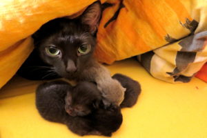Czarna Dama czyli EC Elza Niebieska Perła *PL 12 października okociła się. Trzy maluchy – dwa czarne i jeden niebieski oraz ich mama mają się bardzo dobrze. Nasz dwukolorowy miot „E” kotów rosyjskich niebieskich rośnie zdrowo. Wszystkie trzy kocięta to kotki i każda mała koteczka ma już swoich opiekunów.